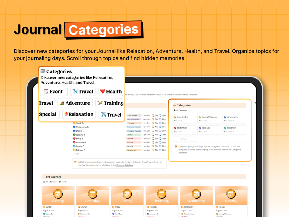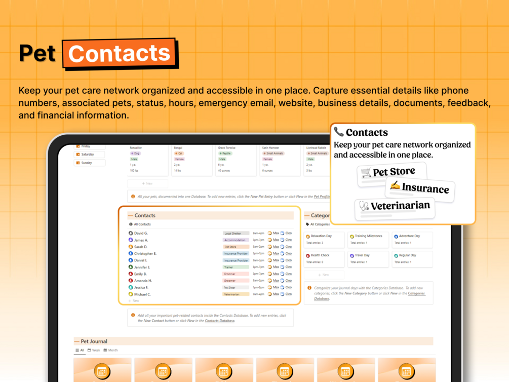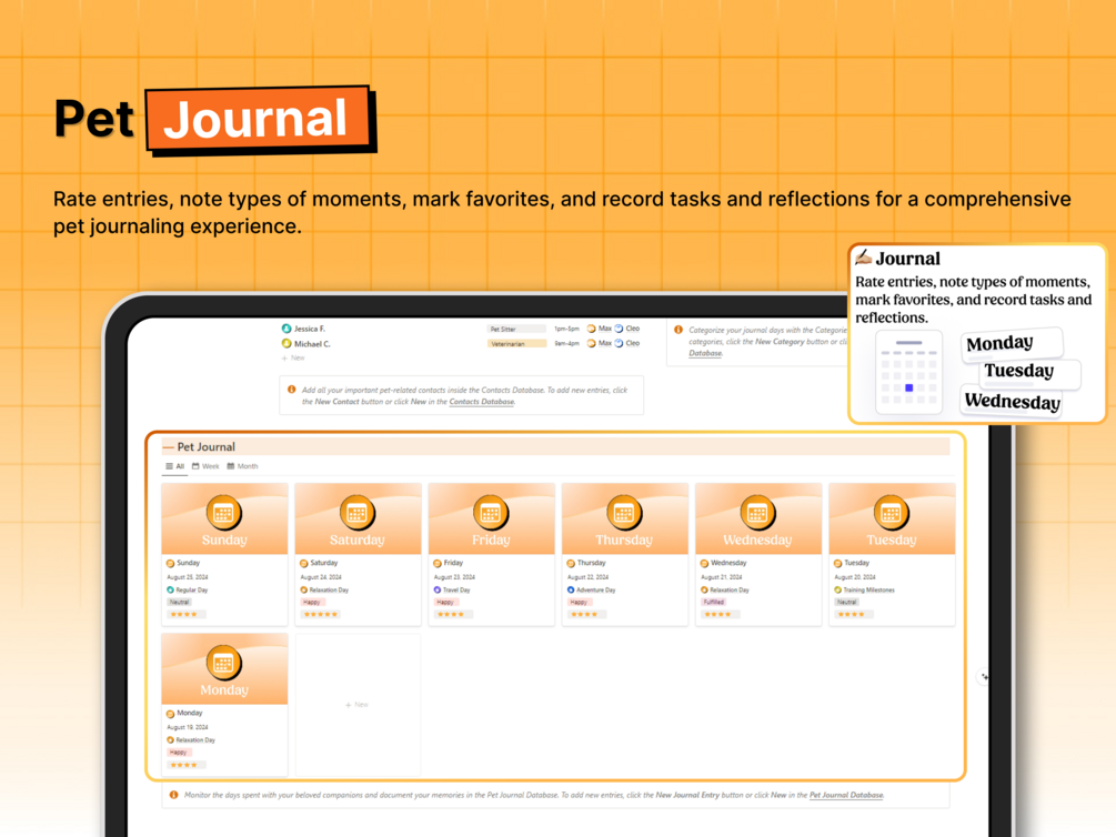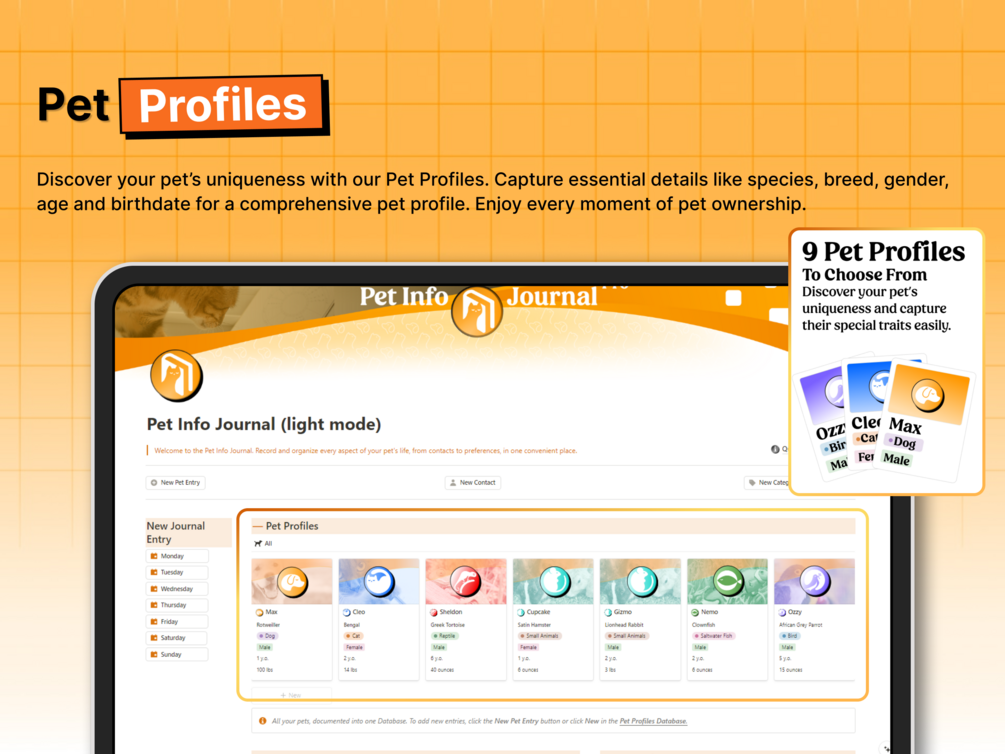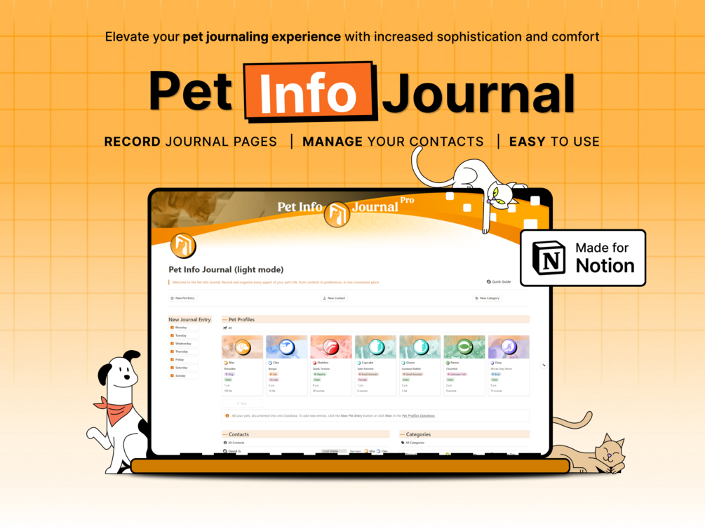 With multiple sections—one for pet profiles, one for contacts, and one for journal entries—The Pet Info Journal Notion System simplifies the process of recording tasks and reflections and managing pet care records and daily routines, freeing up more time for spending quality moments with your pets.